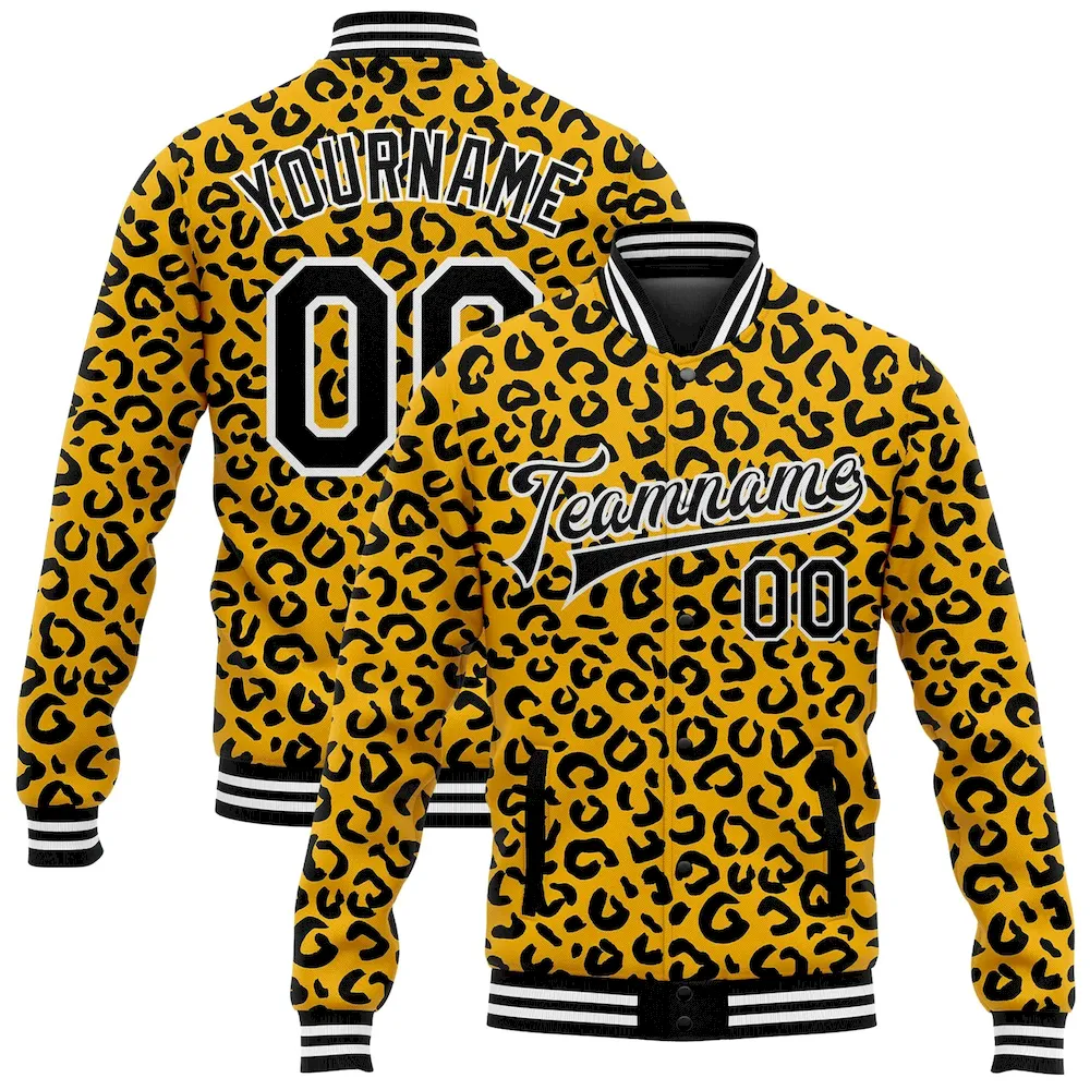 Custom Gold Black-White Leopard Print 3D Pattern Design Bomber Full-Snap Varsity Letterman Jacket