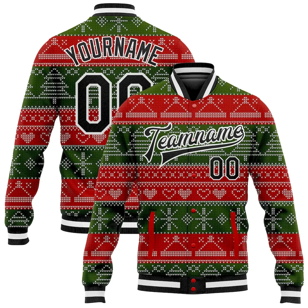 Custom Red Black-Green Christmas 3D Bomber Full-Snap Varsity Letterman Jacket